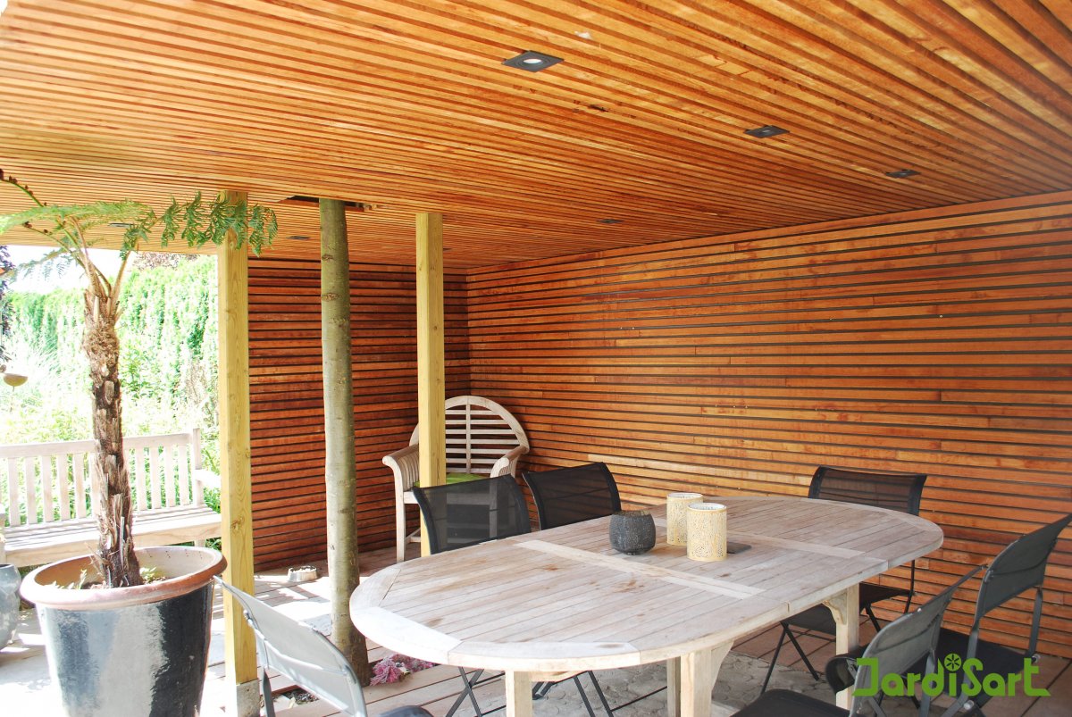 Une terrasse couverte a été intégrée, c'est une pièce de vie supplémentaire à la maison avec son bardage en bois ajouré et son arbre parasol intégré, il habille le toit et apporte de la fraicheur l'été.
