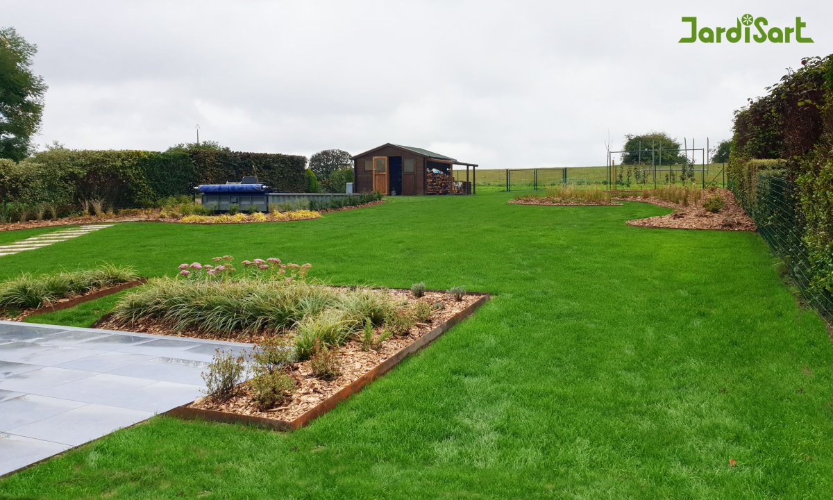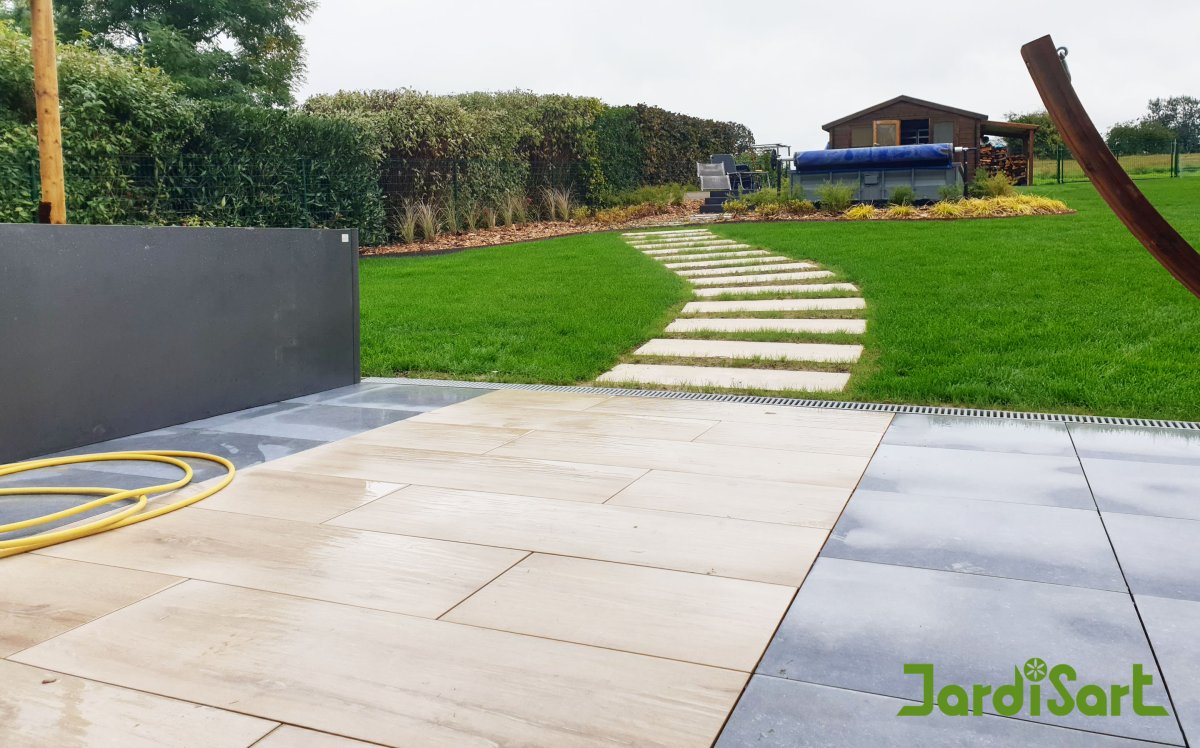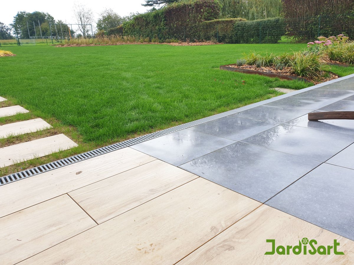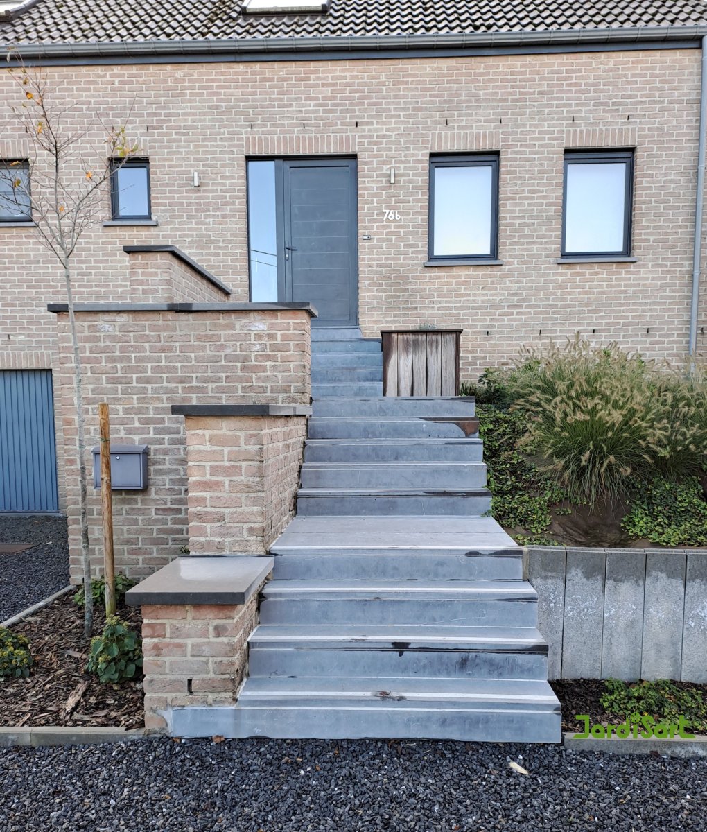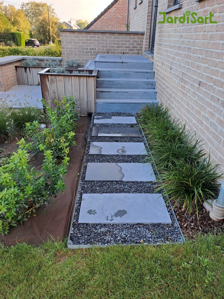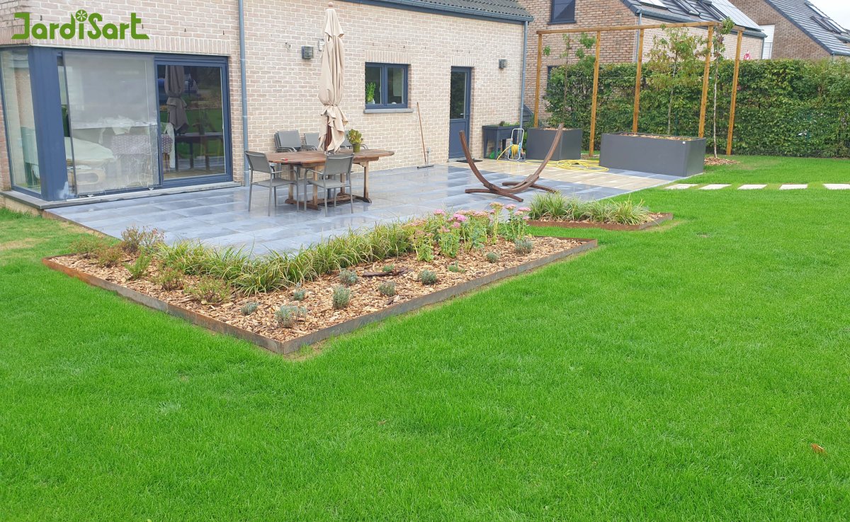 terrassement, nouvelle pelouse, plantations, terrasses, escalier en pierre bleue belge, bordures galvanisées et en acier corten, bac en bois et en acier, etc.