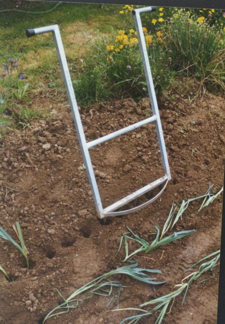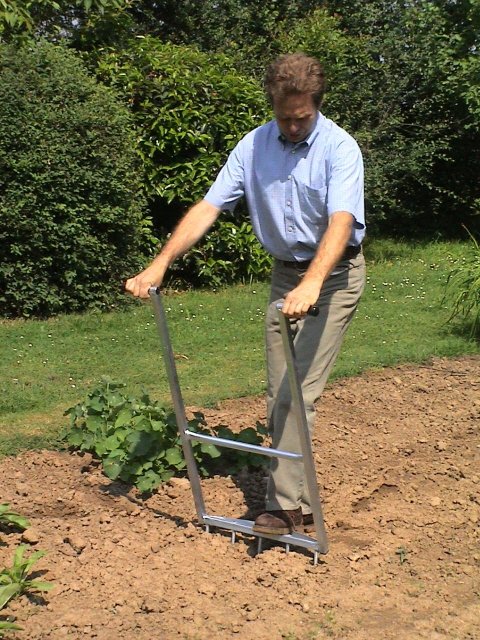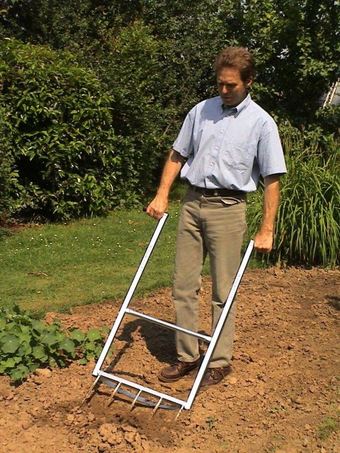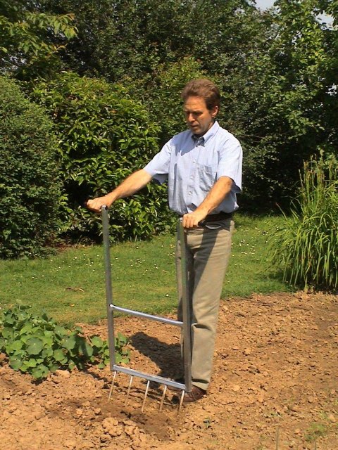 UTILISATION : la large ouverture entre les manches permet le passage du corps tout en maintenant le dos bien droit. Après avoir enfoncé l'outil dans le sol, on tire les manches vers soi afin de soulever le sol ; l'émiettement se fait en basculant l'outil de gauche à droite. Le travail se fait à reculons.