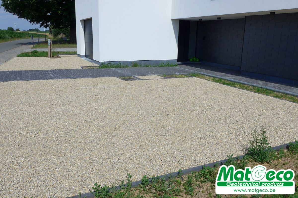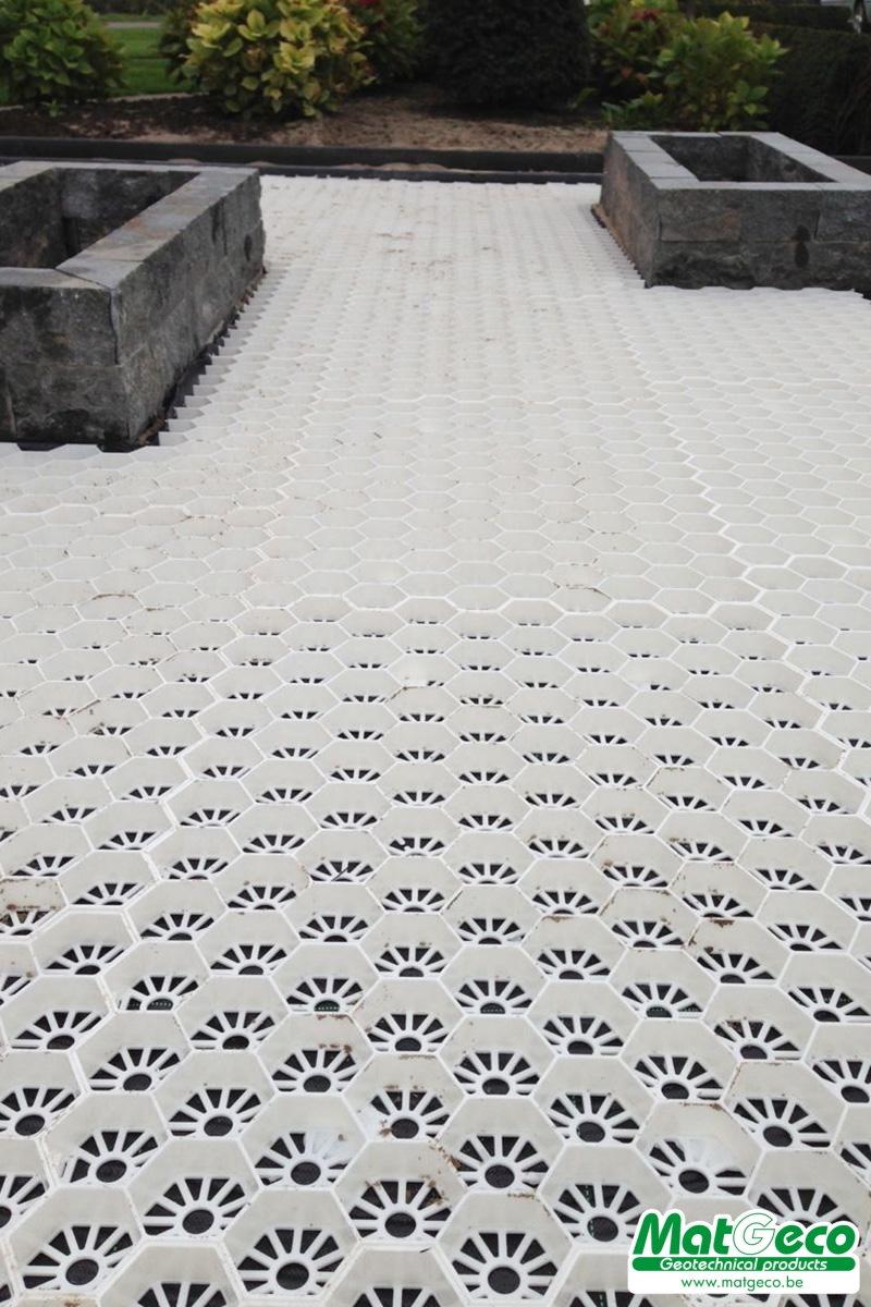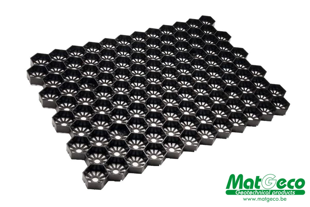 La GridaGravel 34 est une dalle en nids d’abeilles à fond semi-fermé utilisée pour stabiliser le gravier sur les parkings, allées, voies d’accès, sentiers etc. Sa structure hexagonale avec ses parois de 3 mm d’épaisseur est très robuste et résistera une fois remplie à des charges jusqu’à 600 t/m².