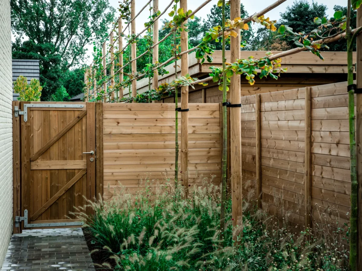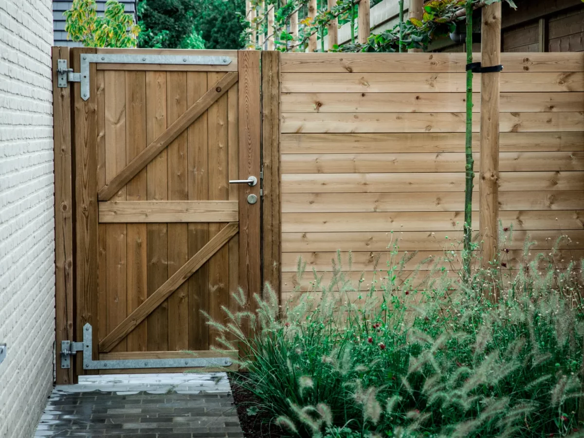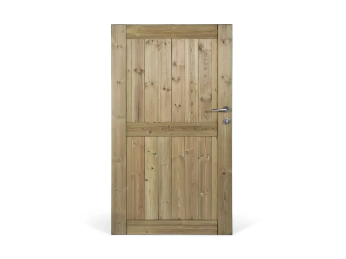 Cette porte simple se compose de lamelles verticales encadrées et est disponible en 3 hauteurs. La porte est également disponible en version double avec 2 hauteurs différentes. Il est possible d'équiper cette porte de lamelles verticales sur demande. Facile à combiner avec des palissades pleins.