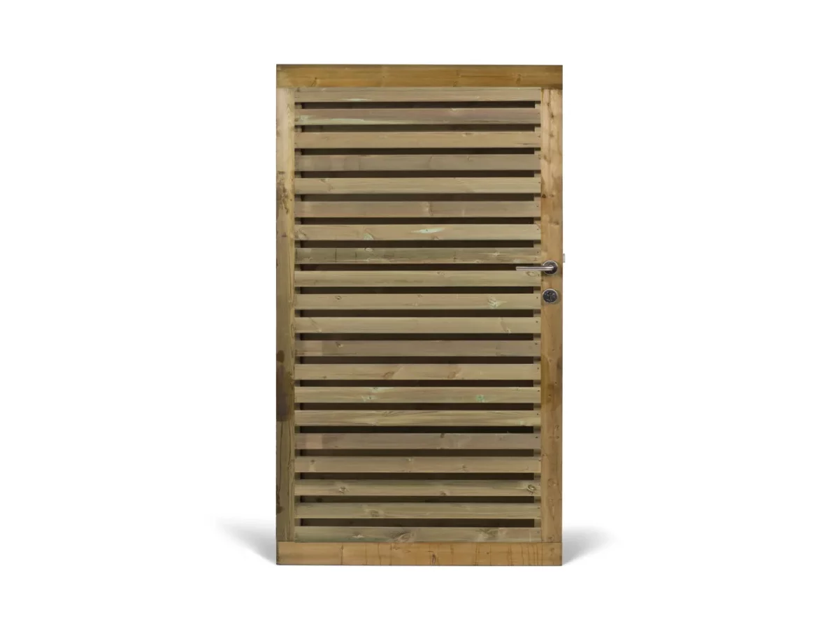 La porte de jardin Villa s'ouvre vers la gauche et, comme l'ensemble de nos produits, est composée de pin rouge du Nord imprégné. Cette porte est disponible en traitement vert ou marron (tanwood). Sachant qu'à terme, Le bois grisera de la même façon.