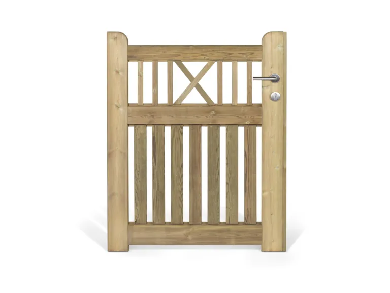 Cette clôture solide est munie de croix ornementales et de lattes verticales. Le portail double existe aussi pour Vivaldi.