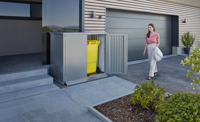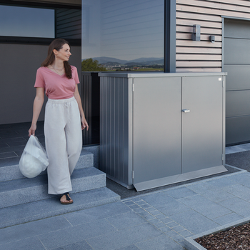 Rien ne ternit plus l'image d'un jardin de devant parfaitement entretenu que des poubelles visibles. Grâce à Biohort, celles-ci peuvent être dissimulées derrière une façade moderne et lisse. Avec le nouveau Alex Duo, le système de tri est logé de manière optimale et une belle image d'ensemble est assurée.