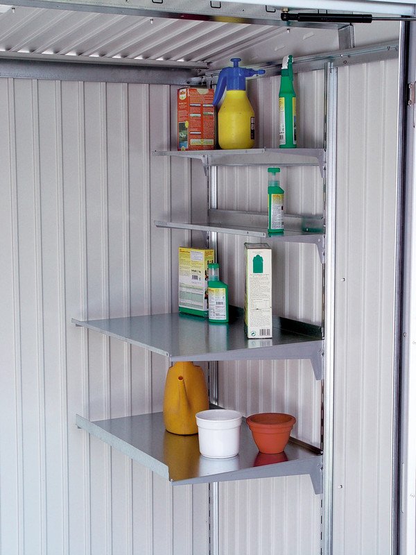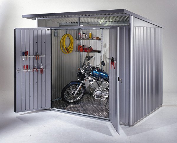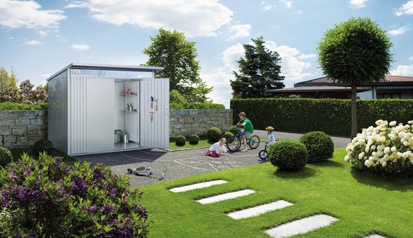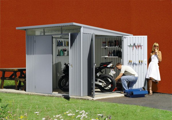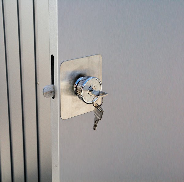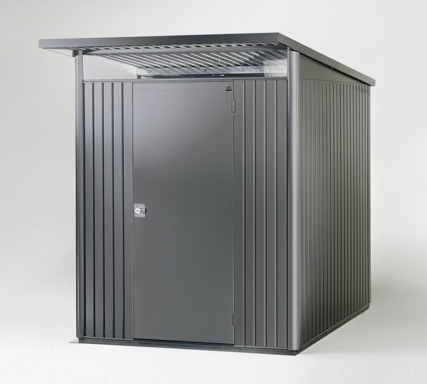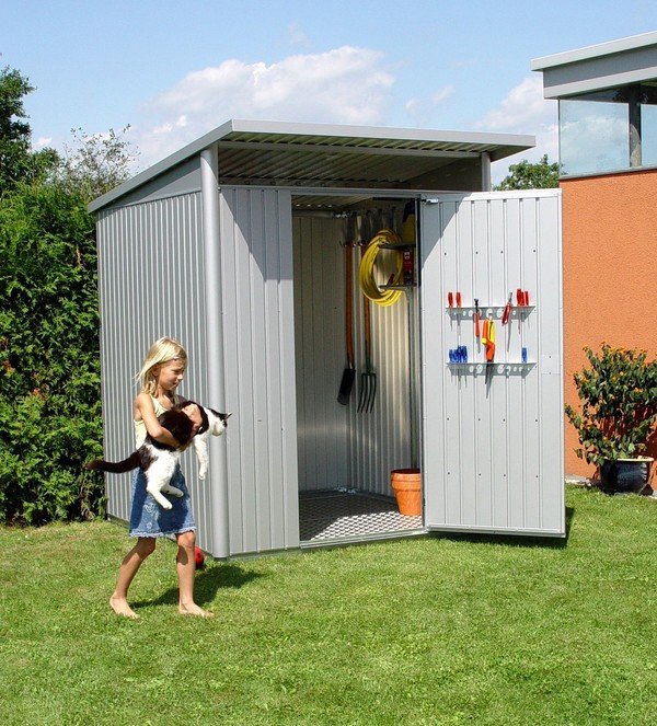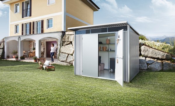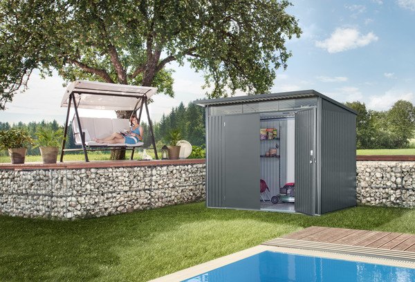 L´abri de jardin AvantGarde est disponible en 3 couleurs (argent métallique, gris quartz métallique et gris foncé métallique) et 8 tailles et peut être commander en simple/double portes avec une porte supplémentaire.