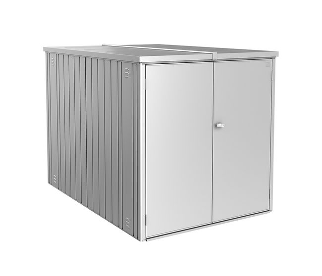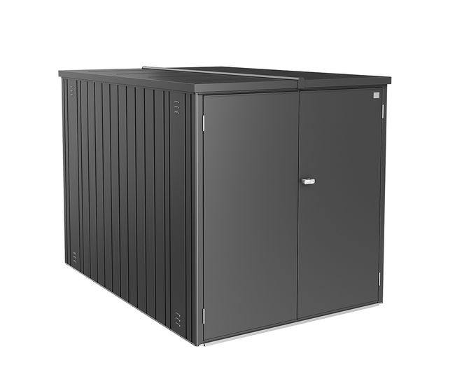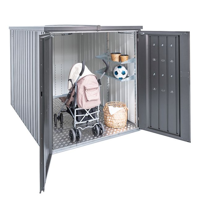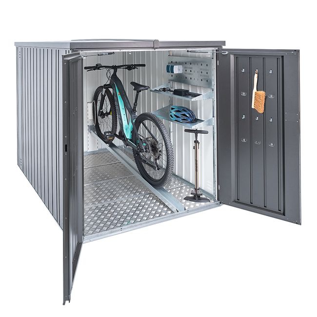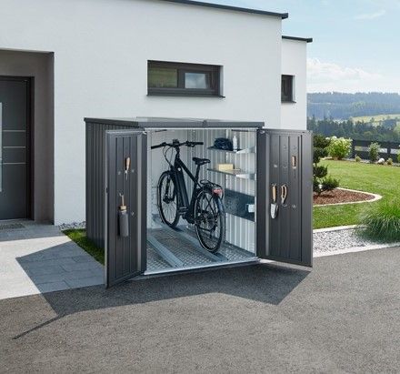 Dans le MiniGarage, vous pouvez ranger idéalement jusqu'à 2 vélos ou des outils, du mobilier de jardin, etc. Le système de rail astucieux (en option) facilite le stockage des vélos : placer la roue avt dans le rail de guidage, la pousser vers l'arrière avec la selle du vélo jusqu'a ce que la roue avant soit dans le support de serrage et c'est fini! Le jeu d'étagères (en option) est idéal pour ranger des accessoires vélos supplémentaires.