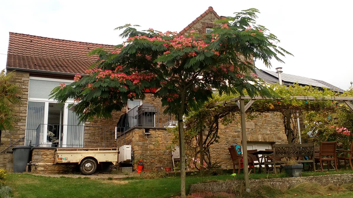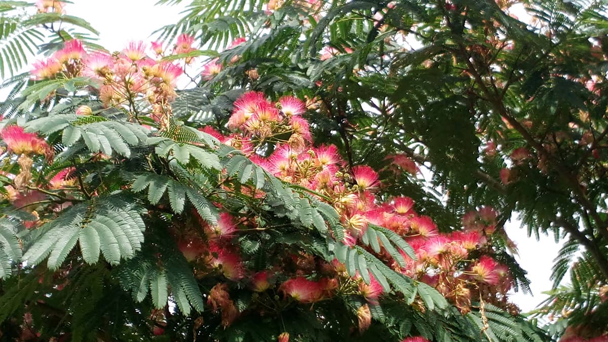 En été, de juillet au début septembre, la plante se couvre de bouquets de fleurs duveteuses, blanc rosé à étamines roses. C'est l'un des plus beaux arbres qui permettent de donner au jardin un aspect méridional.