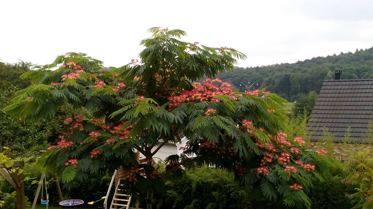 Arbre voisin des acacias. Ses branches largement étalées avec l'âge lui communiquent une forme de parasol ou une cime aplatie au sommet et dont le diamètre excède sensiblement la hauteur. Ses grandes feuilles comprennent de nombreuses folioles de petite taille et ressemblent à des frondes de fougères.