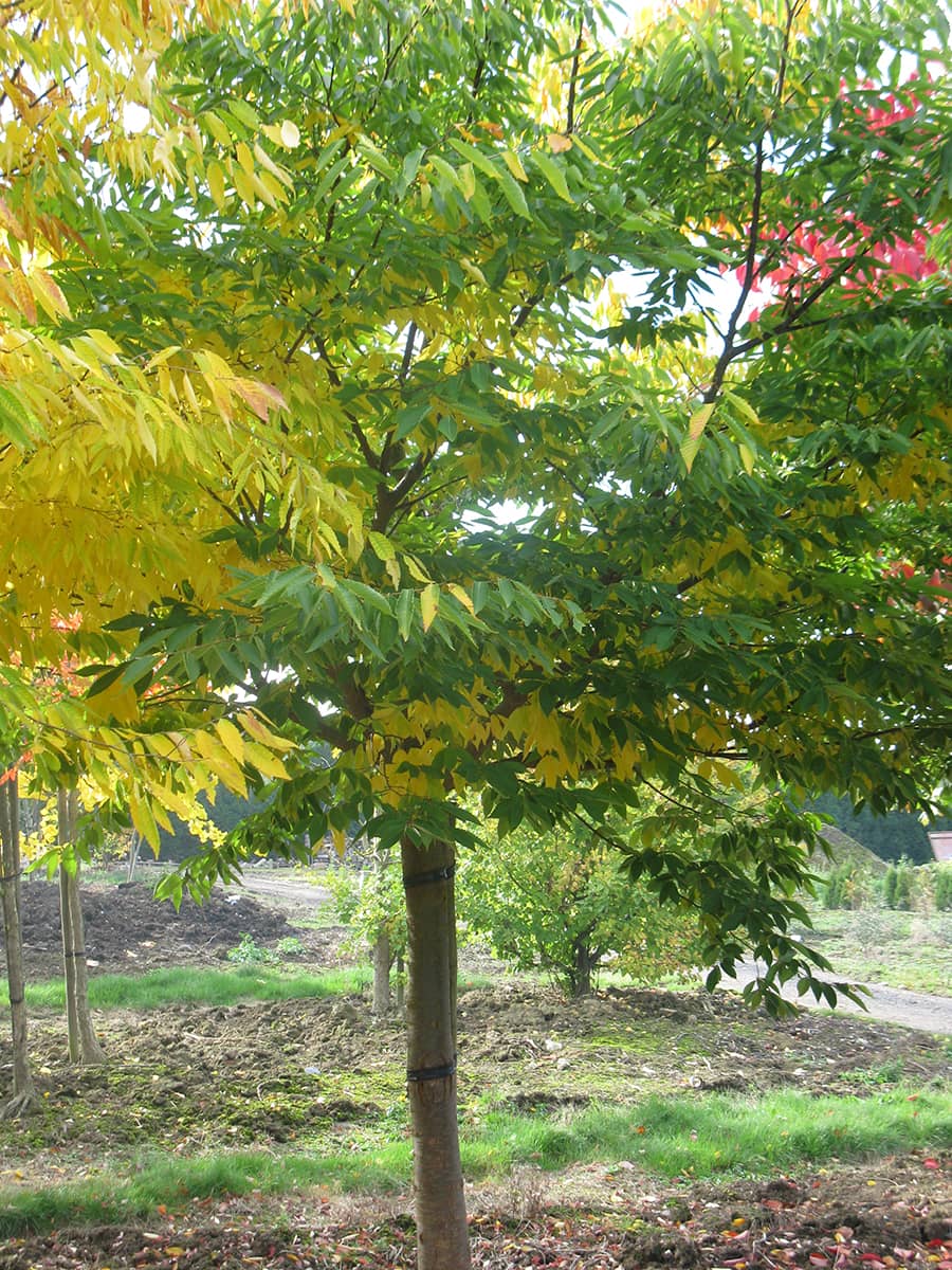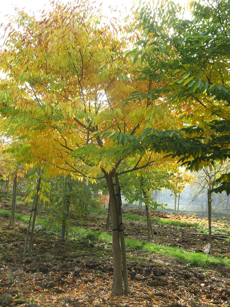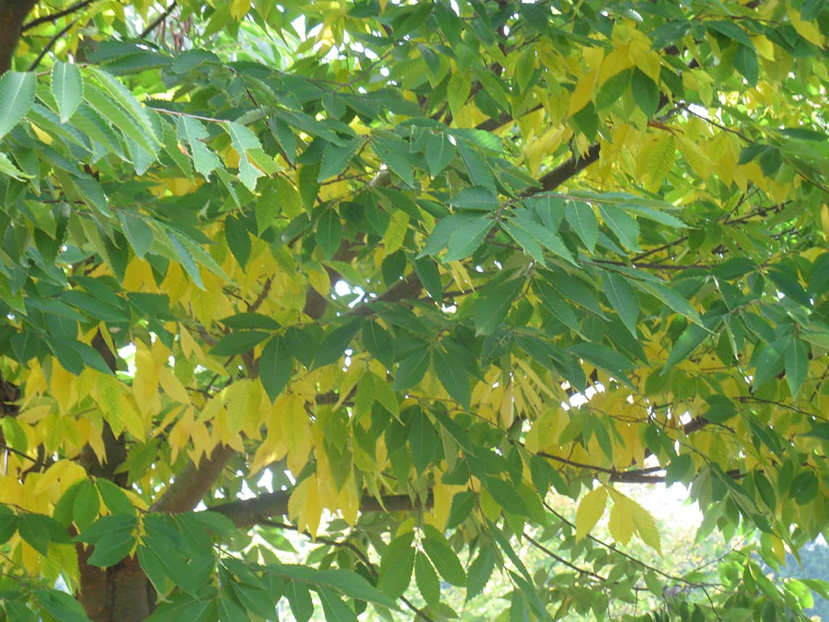 Feuillage caduque, vert foncé, prenant de belles couleurs jaune, rouge orangé à l'automne.