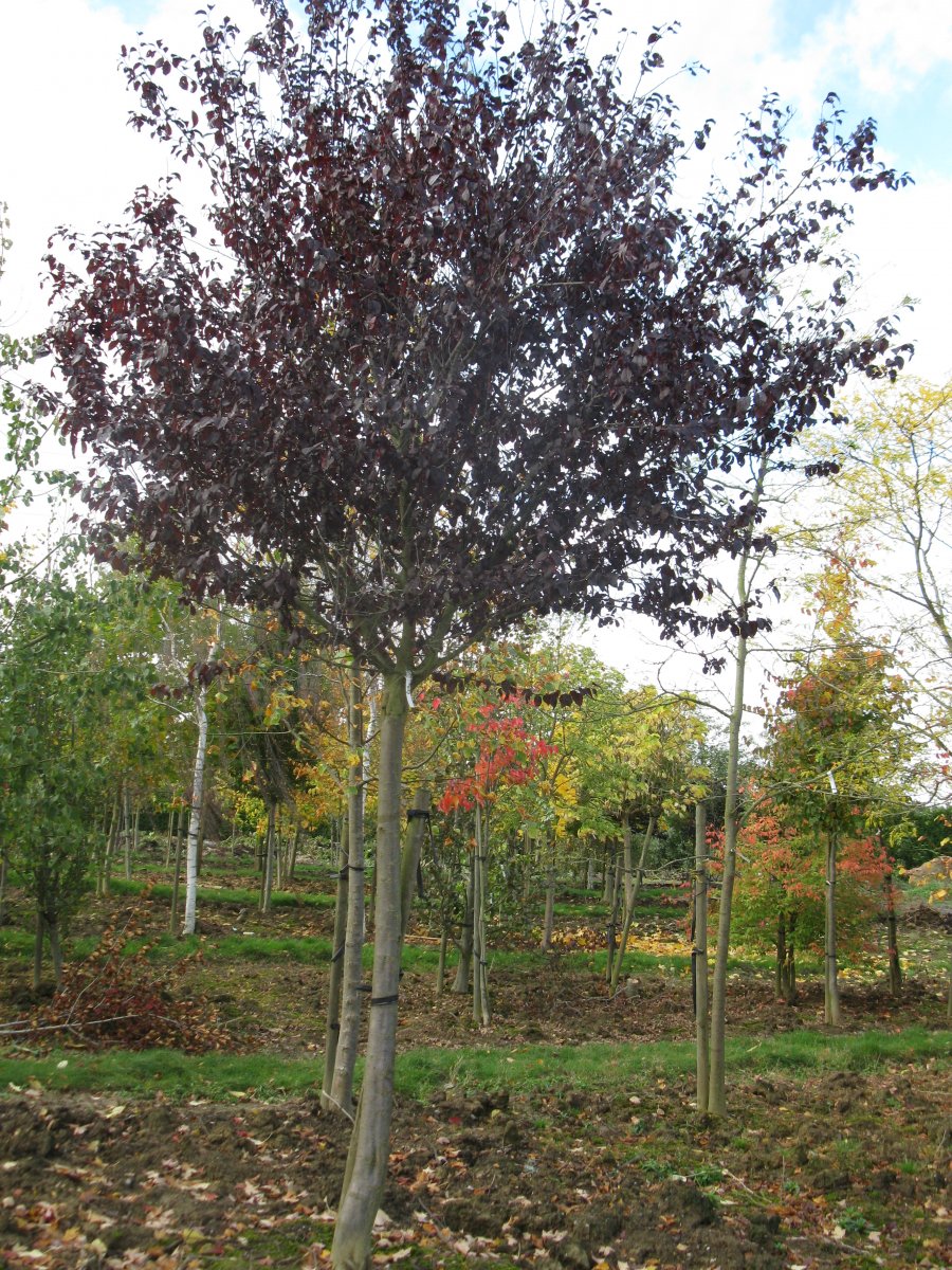 Bel arbre au feuillage pourpre noirâtre et au jeune bois rouge. Multitude de petites fleurs roses puis blanches à l'épanouissement en mars. Forme arrondie. Rustique, s'accommode en tous sols et expositions.