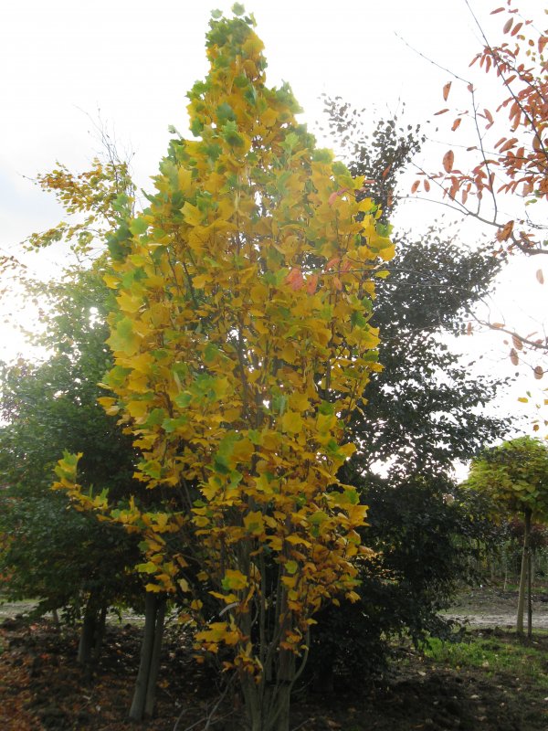 Arbre de grande taille cultivé pour son feuillage exceptionnelle. Feuillage vert, jaune or en automne. Feuilles trilobées, légèrement carrées. Rustique.