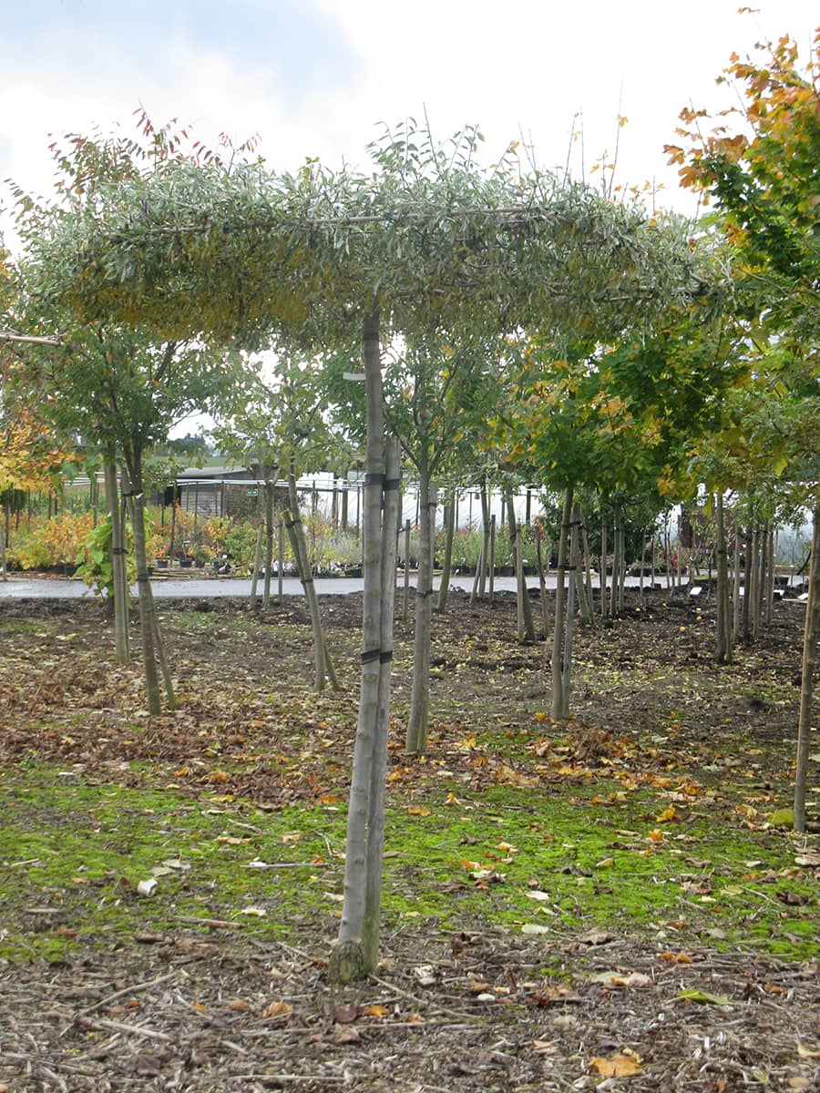 Longs rameaux, petites feuilles étroites gris argenté. S'adapte à tous les sols et résiste bien à la sécheresse. Poires ornementales à la fin de l'été.