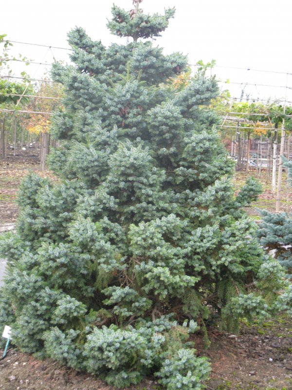 Forme conique large. Feuillage gris bleuté. Supporte très bien les climats et sols secs, même légèrement calcaire. Les jeunes sujets redoutent parfois les hivers très rigoureux.