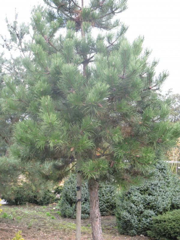 Forme conique large. Croissance rapide. Beau conifère de forme très compacte chez les jeunes sujets. Les branches couvertes de longues aiguilles vert sombre, groupées par 2 sont serrées régulièrement le long du tronc. Il perd ses branches basses après 20-25 ans et prend alors une forme de parasol. Très rustique, il s'adapte à tous les sols même calcaires.