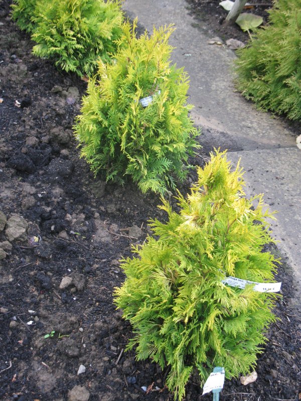 Forme cône. Cône arrondi à végétation lente et compacte. Feuillage jaune d'or au printemps, puis vert doré le reste de l'année. Pour groupes, rocailles et bacs.