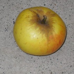 Fruit : grand rond et plat, jaune verdâtre, acidulé et juteux, tendre, idéal pour compote mais aussi à croquer.