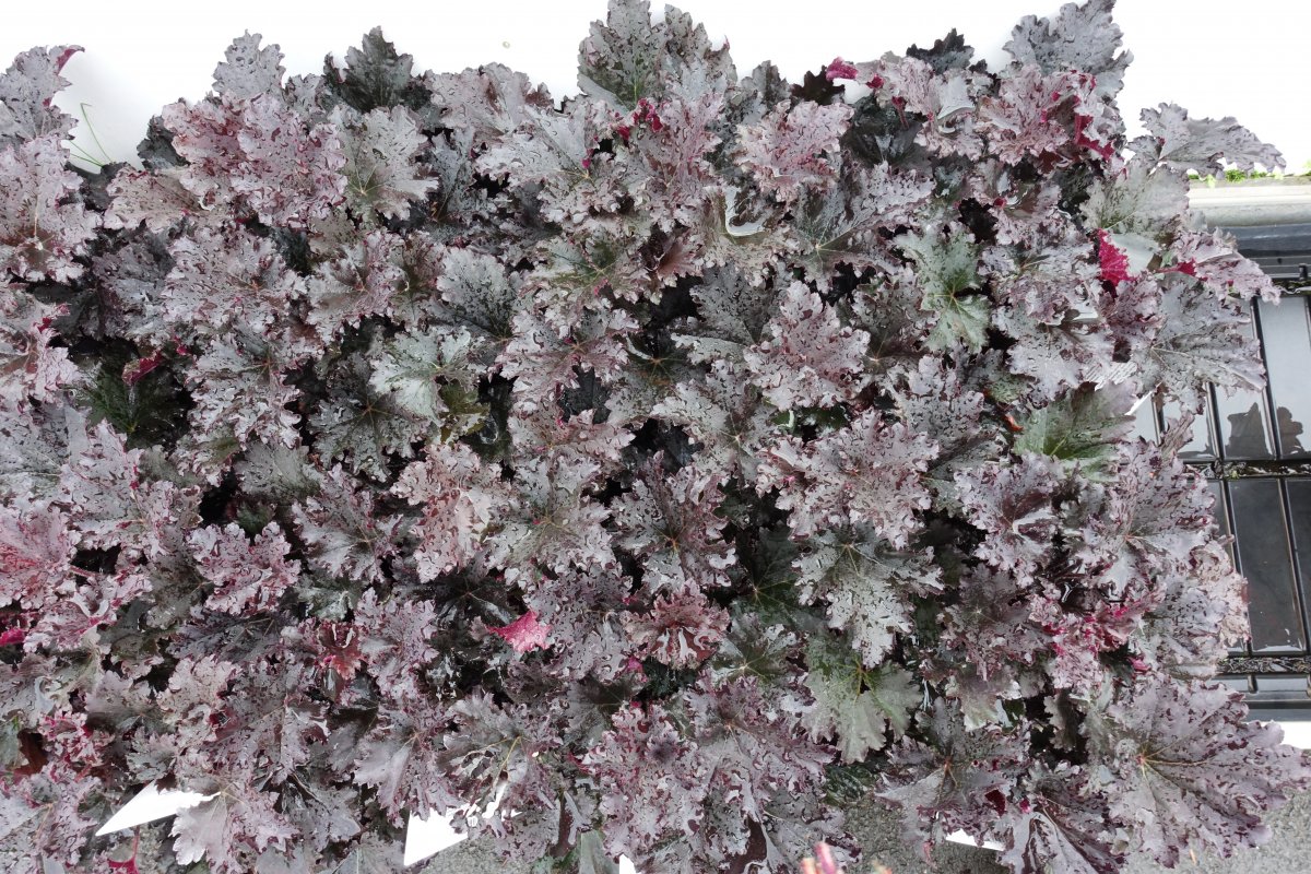 Coussin de feuilles minces, amples, aux lobes anguleux, pourprées et lustrées, très décoratives. Les petites fleurs blanches, portées par des hampes grêlés, semblent flotter au-dessus du feuillage.